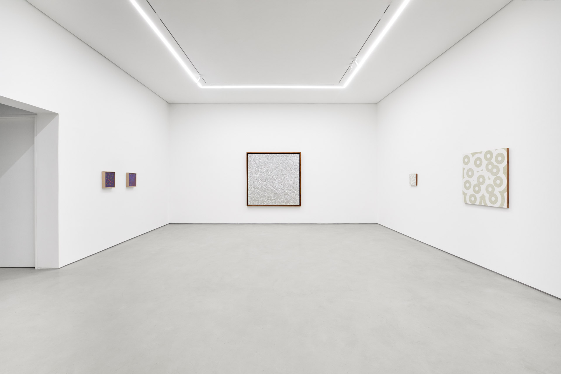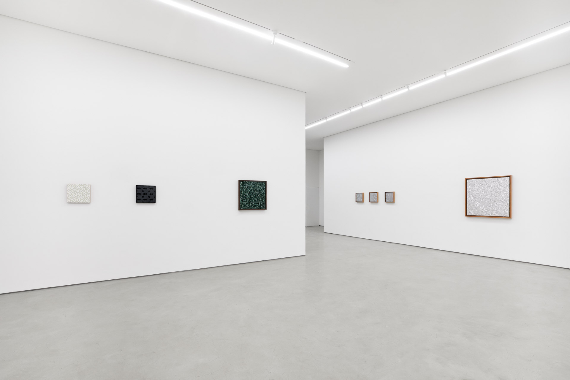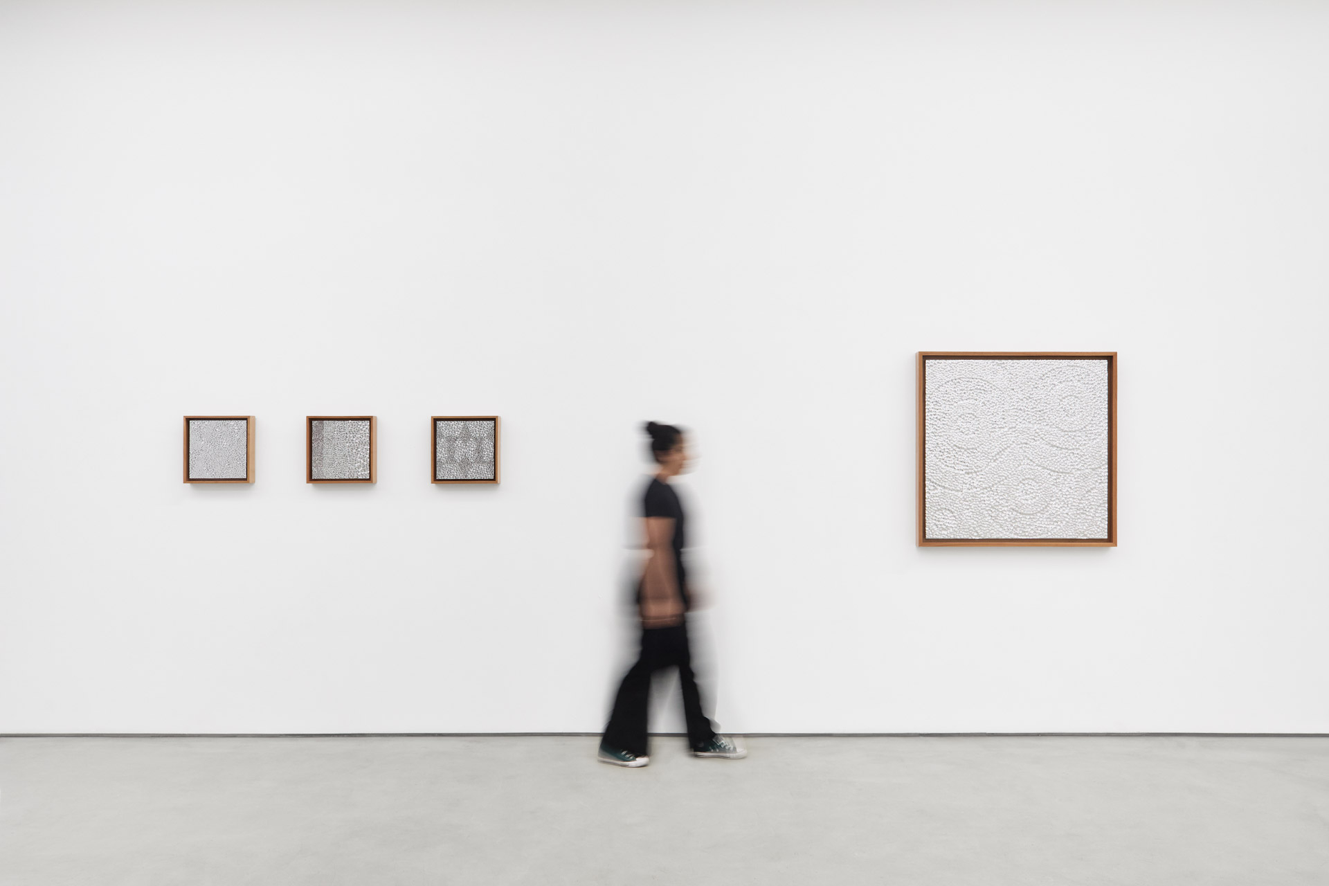 E assim como nas cascas de ovo, tudo aquilo que vem da natureza e se repete é igual, mas diferente. As penas de aves são um material recorrente na prática do artista desde 2018. Cortando pequenas áreas das plumas e pintando-as de cores sólidas, ele cria composições como mosaicos, regulares em sua secção, mas irregulares pela estrutura e superfície das penas. Já os padrões geométricos de asas de borboleta (compradas de diversos projetos de conservação de espécies do inseto que estão ameaçadas de extinção) tem variações milimétricas entre si, mesmo lidas integralmente como idênticas. De la Mora não apenas se apropria das asas, mas as manipula, ora criando retículas mais geométricas, ora estampas que seguem os desenhos das asas, de apenas um ou de ambos os lados (evocando olhos ou camuflagens de folhas e troncos).