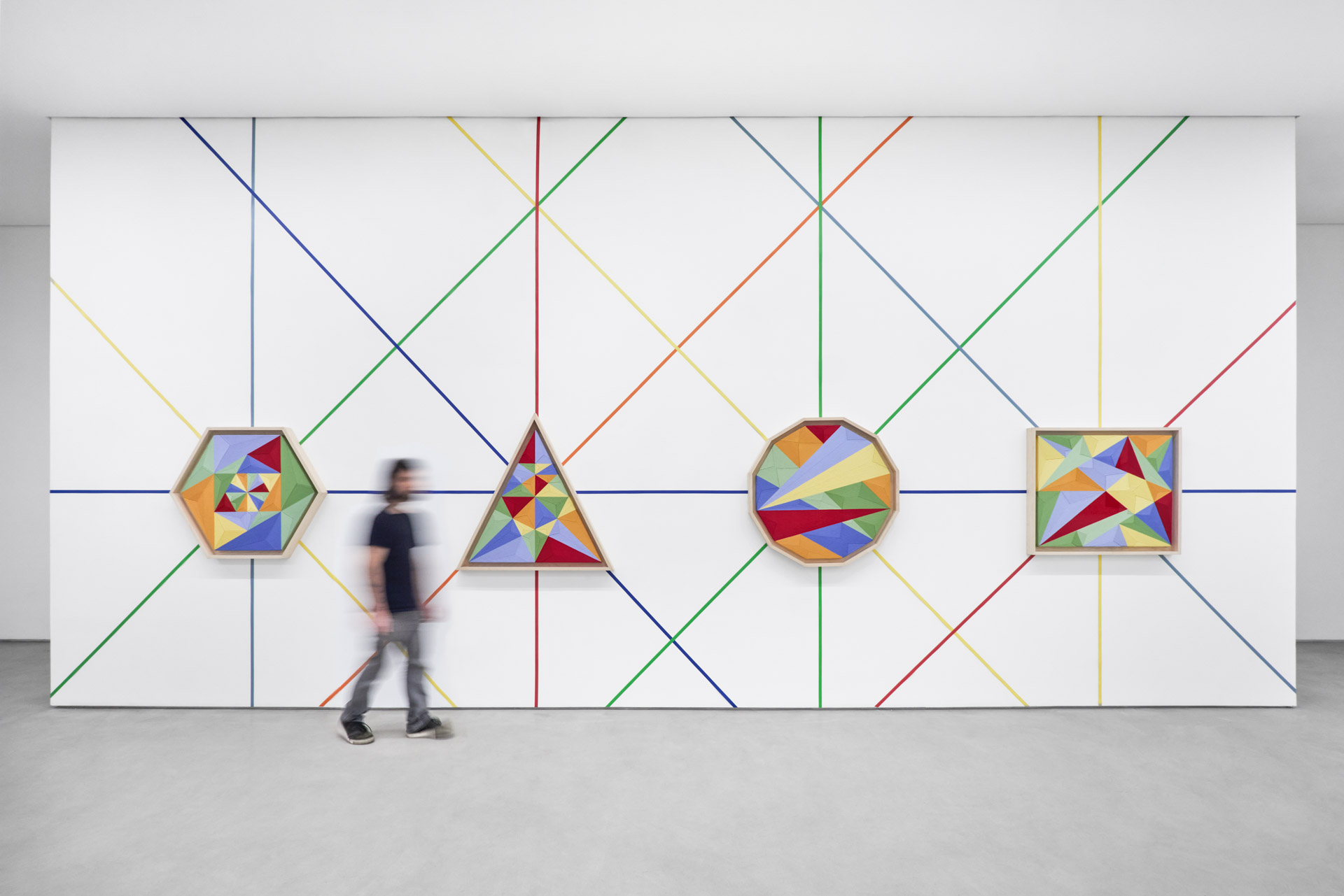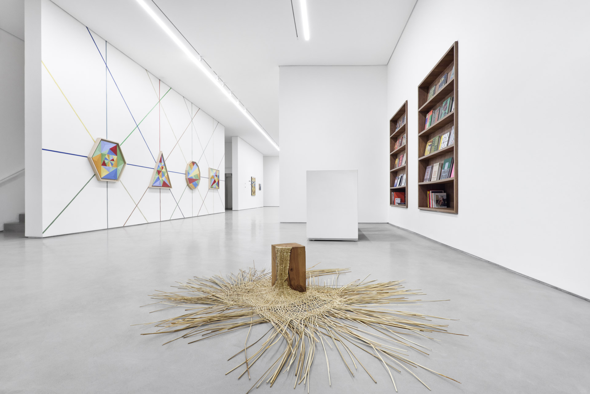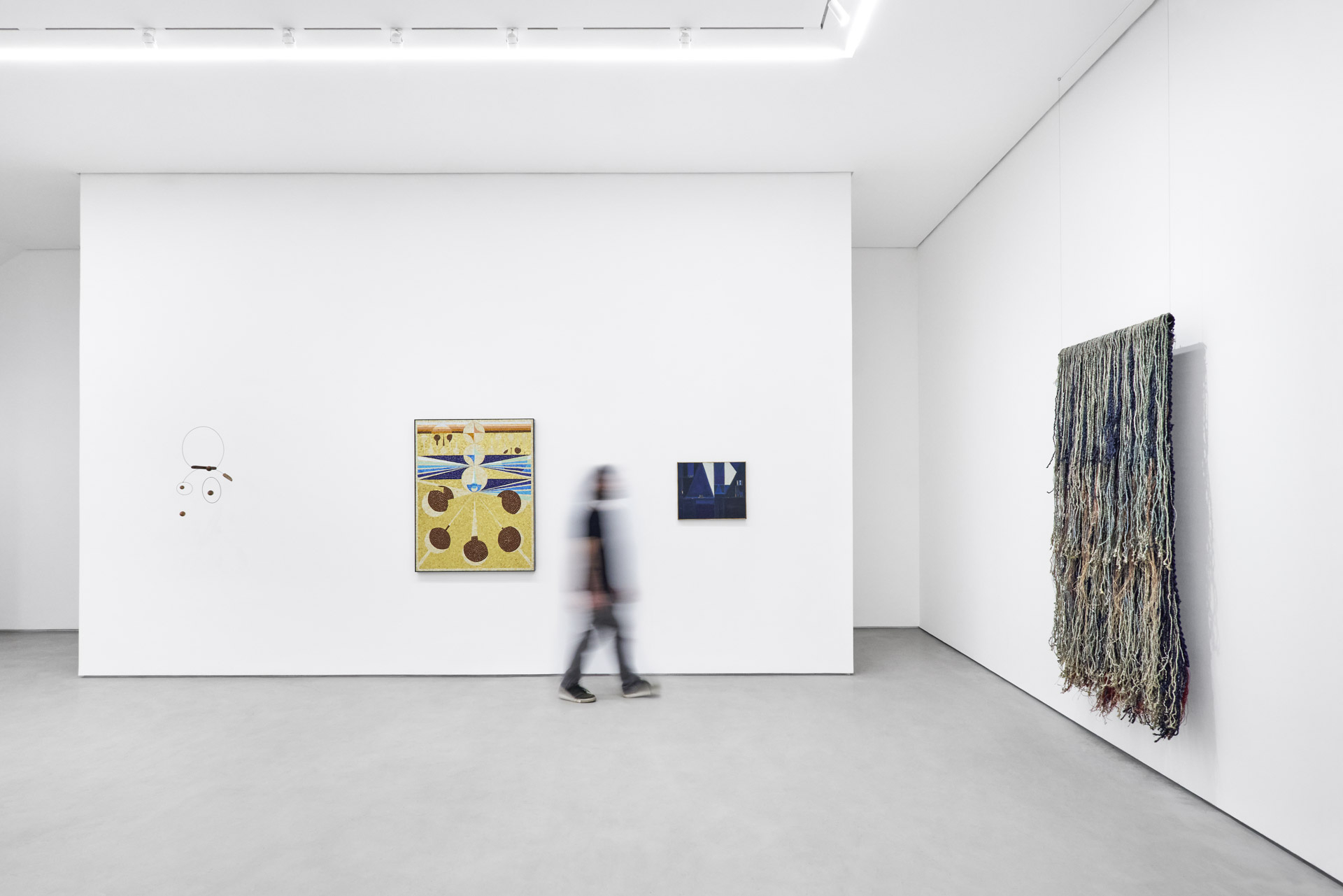 Em obras recentes, Eamon Ore-Giron (Tucson, EUA, 1973) e Eduardo Terrazas (Guadalajara, México, 1936) exploram o cosmos a partir de perspectivas enraizadas nas tradições ameríndias. Ore-Giron, de ascendência peruana, desenvolve composições circulares que remetem a mapas astrais, calendários solares e lunares e formas provenientes de civilizações pré-colombianas do sul da América. Na sua série “Infinite Regress”, o tempo é representado como cíclico, em sintonia com a noção andina "pacha" – termo quéchua que expressa simultaneamente espaço e tempo –, onde passado e presente fazem parte de uma mesma compreensão temporal não evolutiva nem linear, mas em contínuo retorno. Suas pinturas revelam um espaço expansivo por meio de linhas horizontais e estruturas circulares, evocando como grande parte da arquitetura andina existe em diálogo entre a terra, a luz solar e os corpos. Por sua vez, Terrazas funde formas de artesanato mexicano com geometria modernista. Em sua série “Cosmic Variations” (uma expansão de seu projeto Possibilities of a Structure – Cosmos, iniciado na década de 1970), ele combina técnicas da arte huichol, usando fios de lã, cera de Campeche e madeira, para compor imagens vibrantes que representam estruturas estelares, órbitas e planetas. Afim aos efeitos ópticos e geométricos vibratórios, a série “Ventana” do artista brasileiro Mano Penalva (Salvador, 1987) se destaca por criar portais de percepção. Montadas com fitas de nylon, varas de madeira multicoloridas e esmalte, suas esculturas desafiam um único ponto de vista: convidam o espectador a contorná-las e se deslocar diante delas. Essas obras funcionam como interfaces entre dimensões: o que se oculta e se revela diante dos nossos olhos ressalta um tempo que não se move em linha reta e uma profundidade oculta em toda superfície.