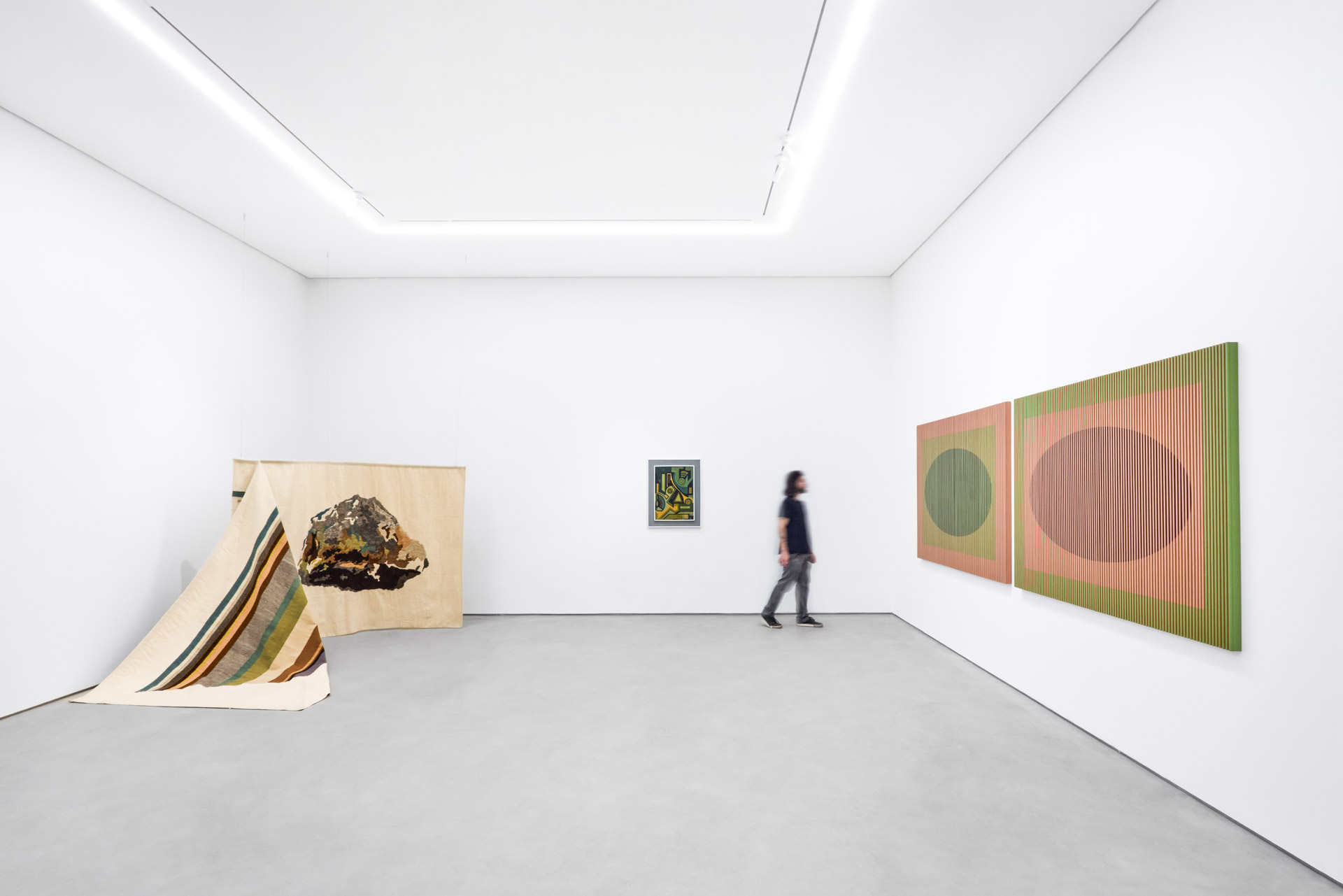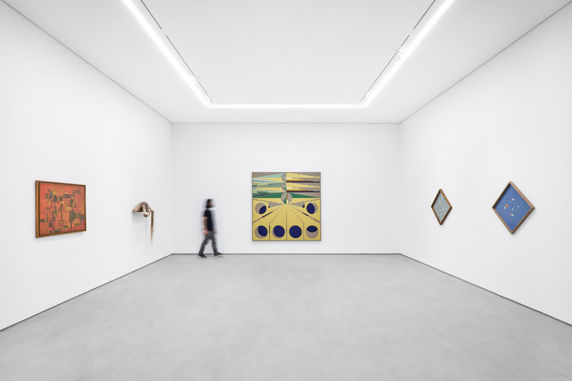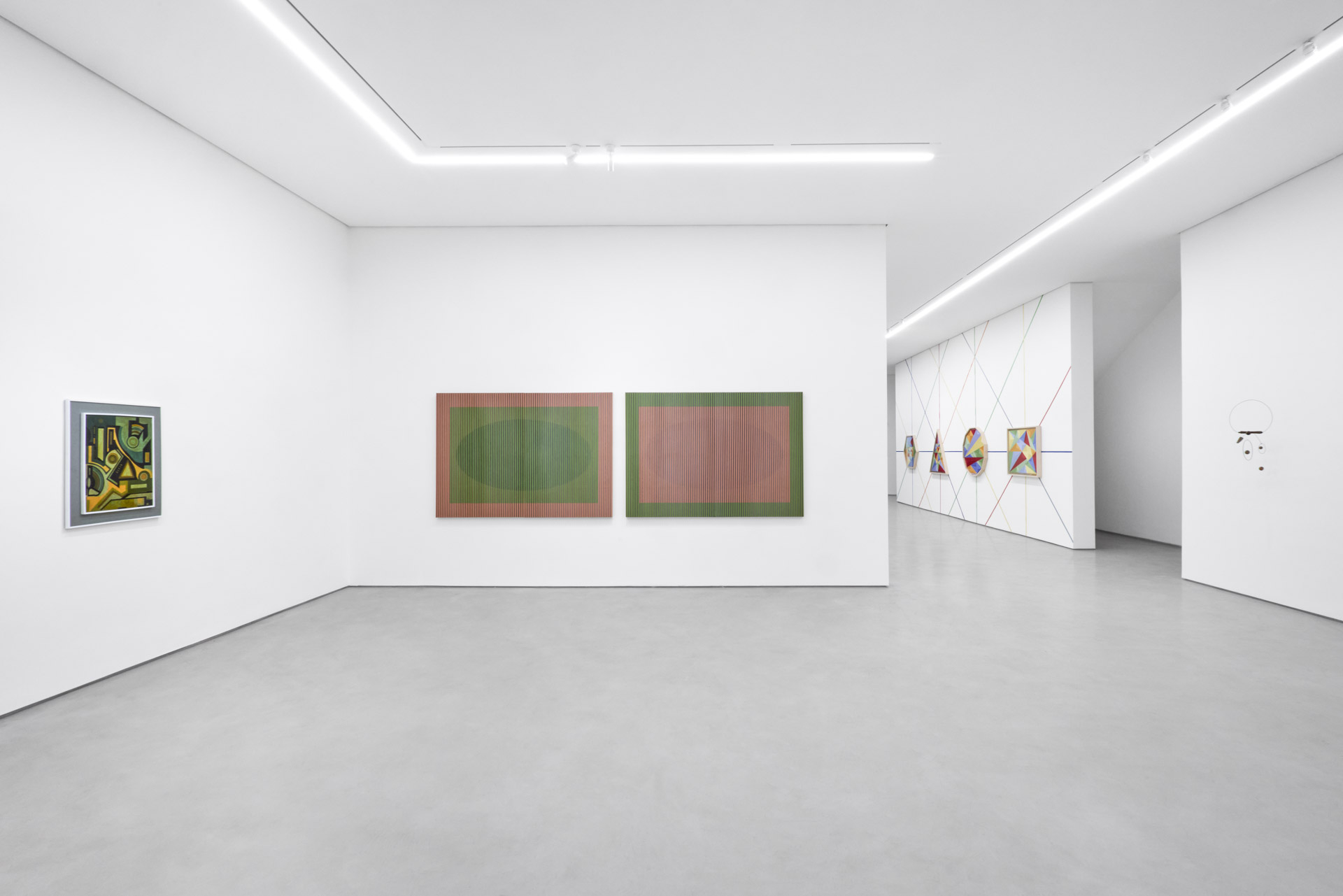 Em obras recentes, Eamon Ore-Giron (Tucson, EUA, 1973) e Eduardo Terrazas (Guadalajara, México, 1936) exploram o cosmos a partir de perspectivas enraizadas nas tradições ameríndias. Ore-Giron, de ascendência peruana, desenvolve composições circulares que remetem a mapas astrais, calendários solares e lunares e formas provenientes de civilizações pré-colombianas do sul da América. Na sua série “Infinite Regress”, o tempo é representado como cíclico, em sintonia com a noção andina "pacha" – termo quéchua que expressa simultaneamente espaço e tempo –, onde passado e presente fazem parte de uma mesma compreensão temporal não evolutiva nem linear, mas em contínuo retorno. Suas pinturas revelam um espaço expansivo por meio de linhas horizontais e estruturas circulares, evocando como grande parte da arquitetura andina existe em diálogo entre a terra, a luz solar e os corpos. Por sua vez, Terrazas funde formas de artesanato mexicano com geometria modernista. Em sua série “Cosmic Variations” (uma expansão de seu projeto Possibilities of a Structure – Cosmos, iniciado na década de 1970), ele combina técnicas da arte huichol, usando fios de lã, cera de Campeche e madeira, para compor imagens vibrantes que representam estruturas estelares, órbitas e planetas. Afim aos efeitos ópticos e geométricos vibratórios, a série “Ventana” do artista brasileiro Mano Penalva (Salvador, 1987) se destaca por criar portais de percepção. Montadas com fitas de nylon, varas de madeira multicoloridas e esmalte, suas esculturas desafiam um único ponto de vista: convidam o espectador a contorná-las e se deslocar diante delas. Essas obras funcionam como interfaces entre dimensões: o que se oculta e se revela diante dos nossos olhos ressalta um tempo que não se move em linha reta e uma profundidade oculta em toda superfície.