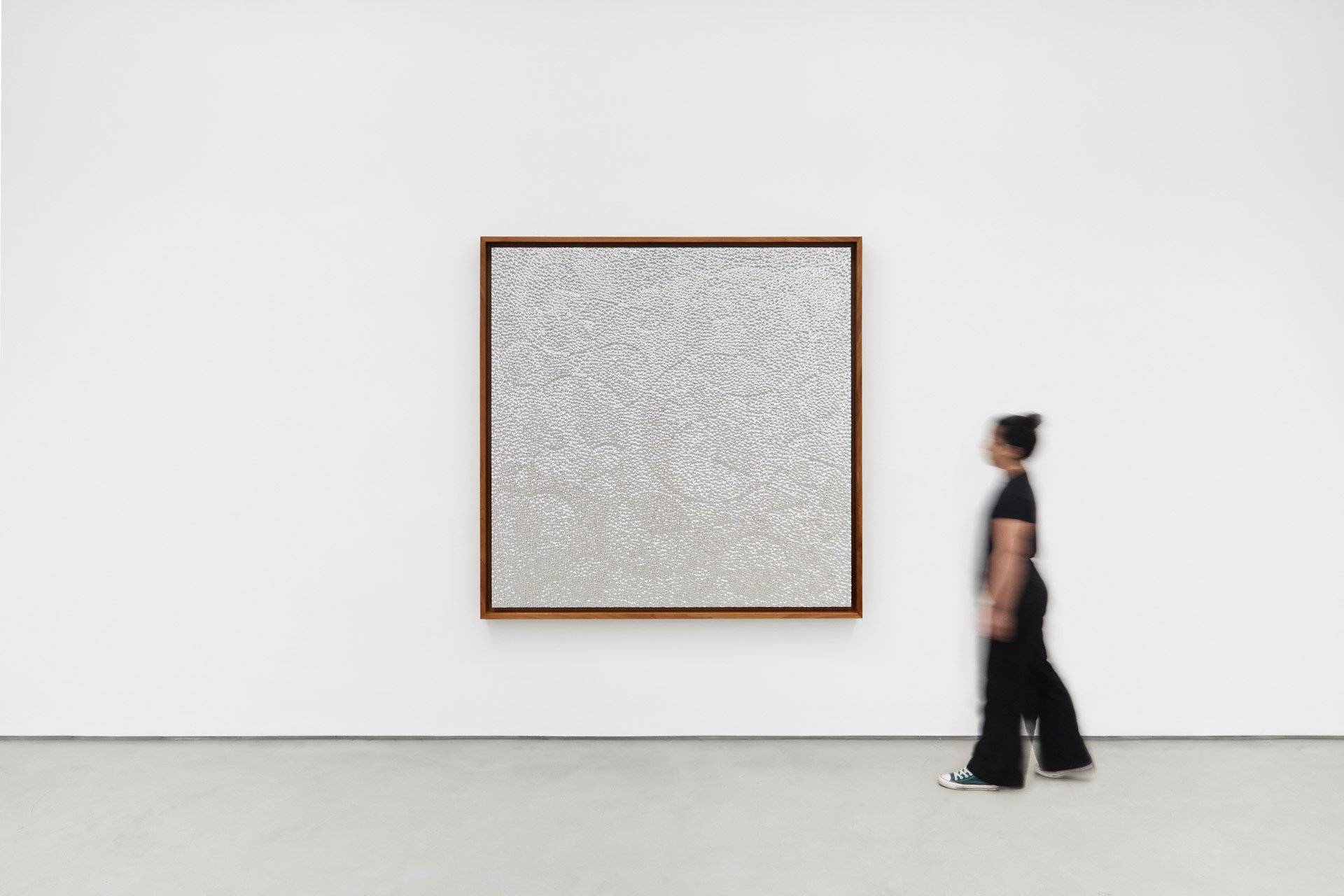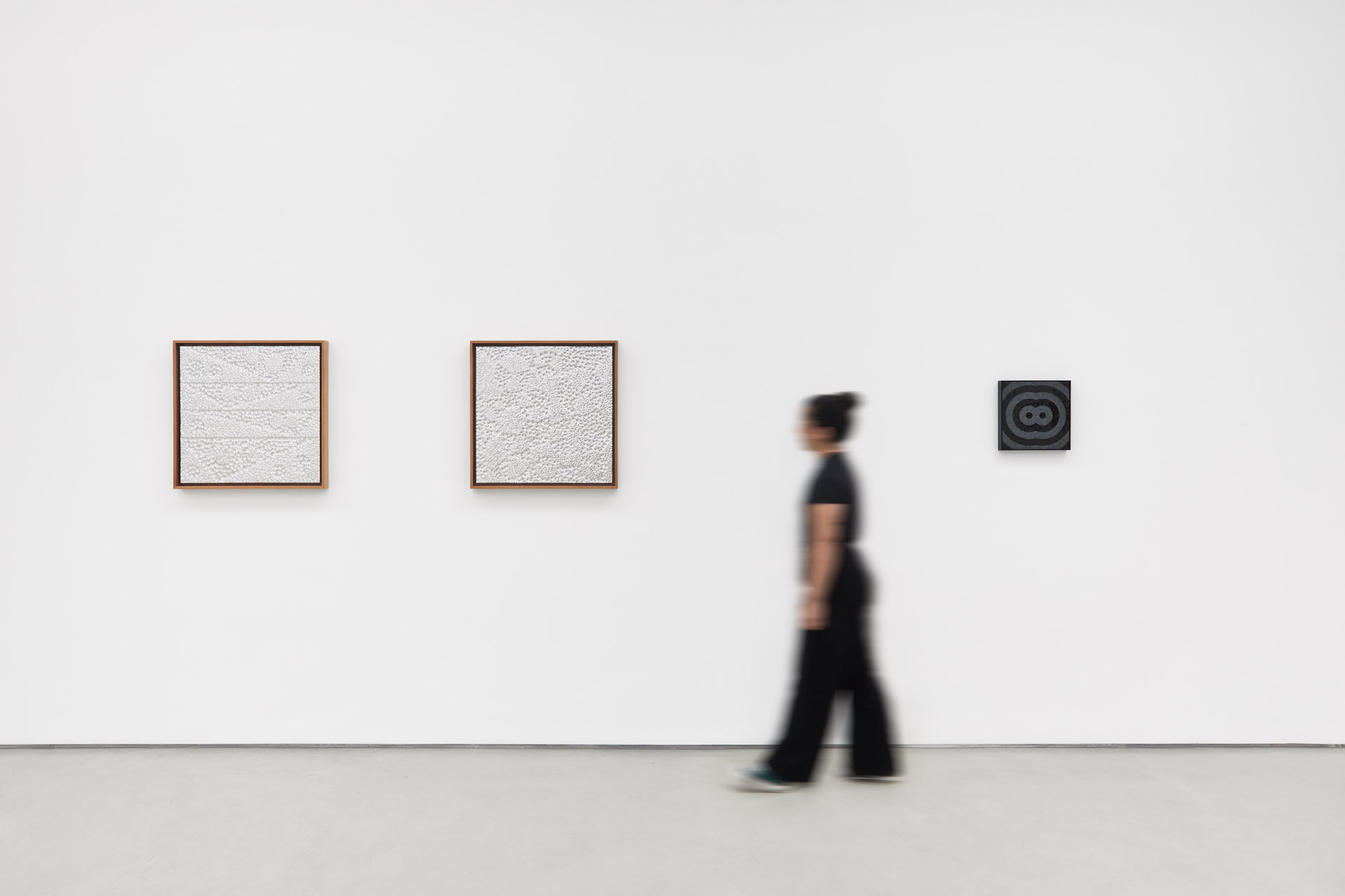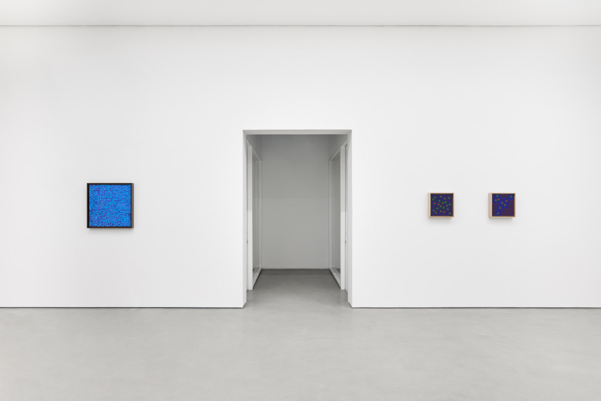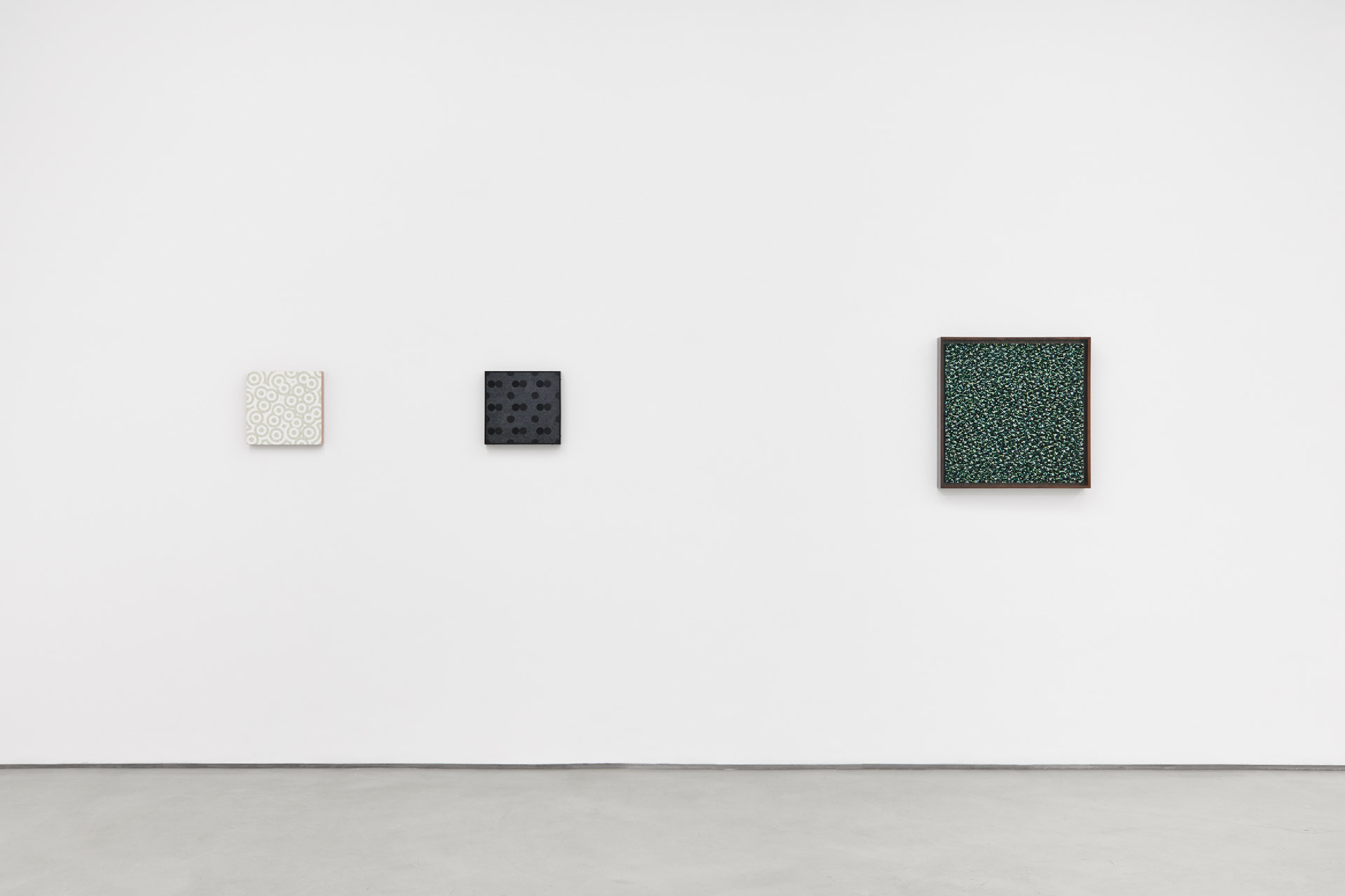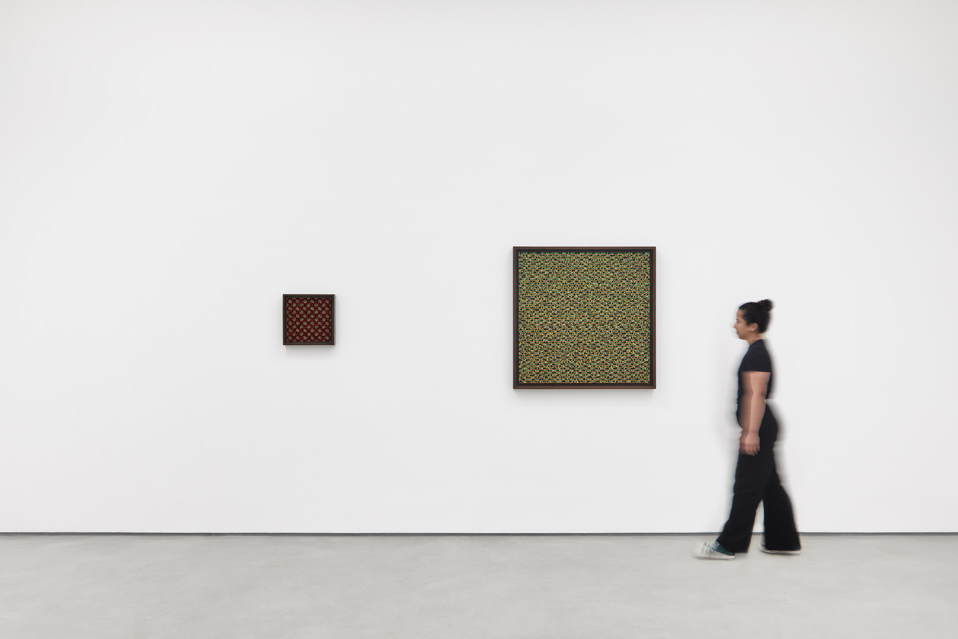 E assim como nas cascas de ovo, tudo aquilo que vem da natureza e se repete é igual, mas diferente. As penas de aves são um material recorrente na prática do artista desde 2018. Cortando pequenas áreas das plumas e pintando-as de cores sólidas, ele cria composições como mosaicos, regulares em sua secção, mas irregulares pela estrutura e superfície das penas. Já os padrões geométricos de asas de borboleta (compradas de diversos projetos de conservação de espécies do inseto que estão ameaçadas de extinção) tem variações milimétricas entre si, mesmo lidas integralmente como idênticas. De la Mora não apenas se apropria das asas, mas as manipula, ora criando retículas mais geométricas, ora estampas que seguem os desenhos das asas, de apenas um ou de ambos os lados (evocando olhos ou camuflagens de folhas e troncos).